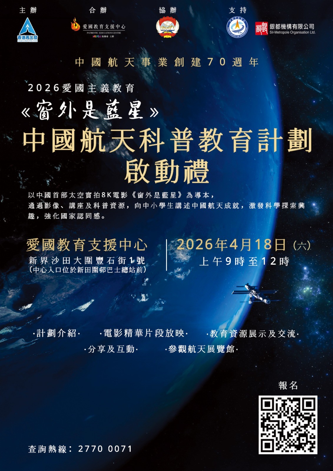 活動以中國首部太空實拍8K超高清電影《窗外是藍星》為藍本,旨在透過極具視覺震撼的影像、專業的科普講座及豐富的教學資源,帶領全港中小學生踏上一場奇妙的太空之旅。藉此讓他們深入了解中國航天事業的輝煌成就,激發對科學探索的濃厚興趣,從而強化國家認同,築牢愛國情懷。